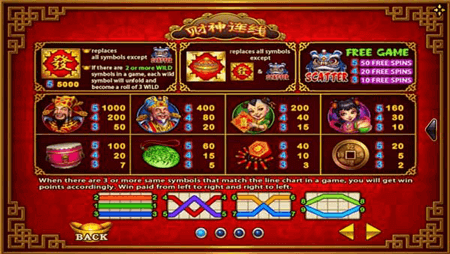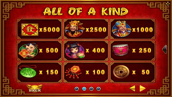 สำหรับสัญลักษณ์ในเกมนี้ ก็จะมี เทวดาฮกล่กซิ่ว กลองจีน ประทัด เหรียญนำโชค เชิดสิงโต เด็ก ฮ่องเต้ ซึ่งในแต่ละสัญลักษณ์ก็จะมีอัตราการคูณเงินรางวัลที่แตกต่างกันออกไป ซึ่งสัญลักษณ์ที่คูณสูงที่สุดนั่นก็คือ เทวดาฮกล่กซิ่ว ซึ่งจะมีอัตราการคูณเงินรางวัลถึง 2500 เท่าเลยทีเดียว