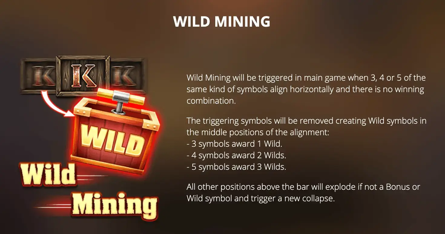 จัดตำแหน่งสัญลักษณ์ที่คล้ายกัน 3 ถึง 5 ตัวในแนวนอนบนวงล้อเพื่อเรียกใช้คุณสมบัติ Wild Mining ไอคอนที่เรียกจะถูกแทนที่ด้วย Wilds ขึ้นอยู่กับจำนวนที่คุณลงจอดตามรายการด้านล่าง: