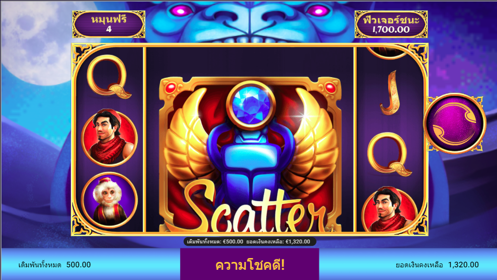 สัญลักษณ์ Scatter เมื่อปรากฏครบ 3อัน ที่วงล้อไหนก็ได้แล้วจะได้รับโบนัสฟีเจอร์ ฟรีสปิน 6 รอบ